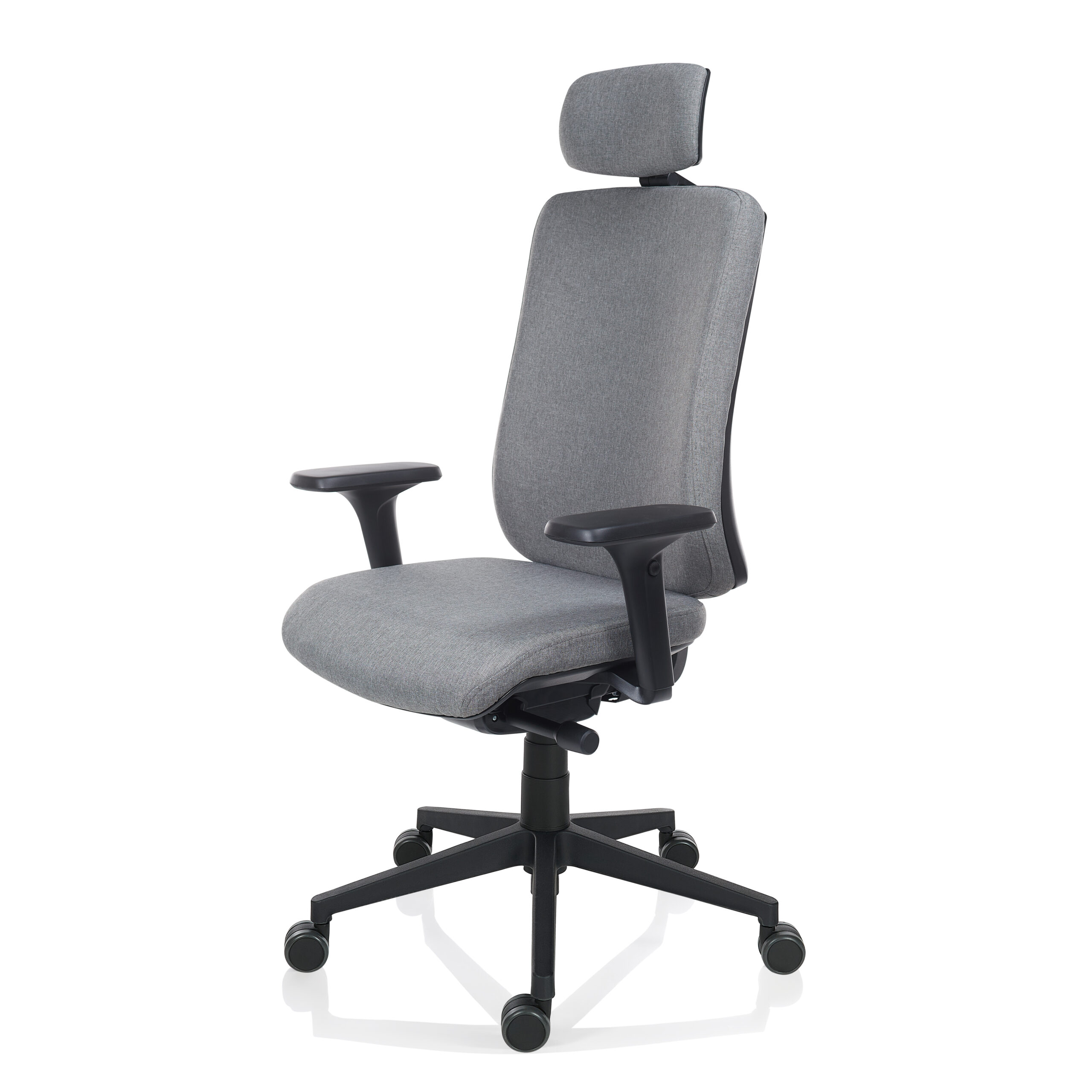 Mecanismul sincron multibloc cu antișoc permite balansarea fluidă sau blocarea șezutului în poziție avansată, încurajând mișcarea și variabilitatea posturilor de lucru. Rolele gumate cu diametru mare facilitează deplasarea lină a scaunului, protejând diversele suprafețe ale pardoselii.